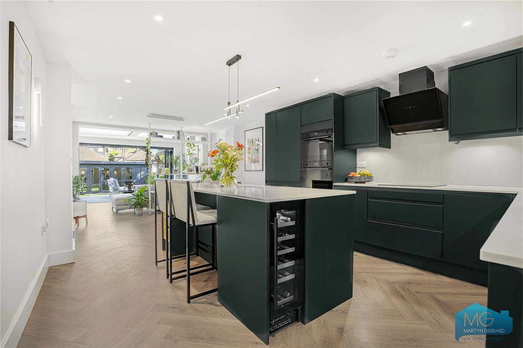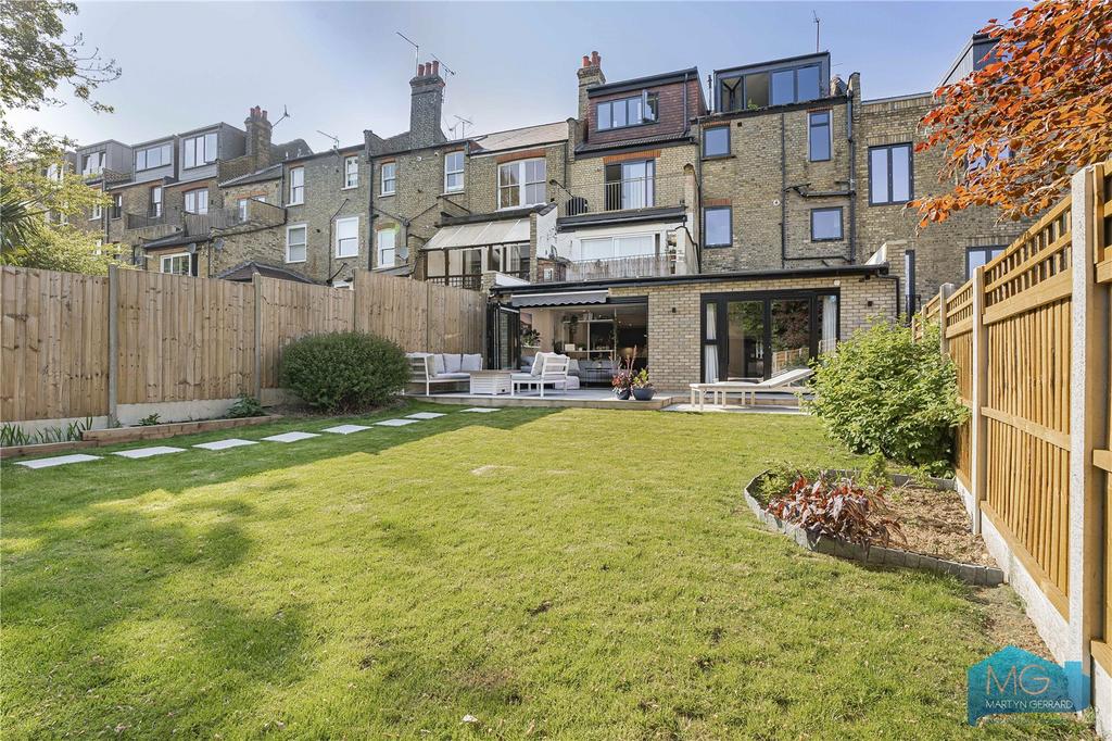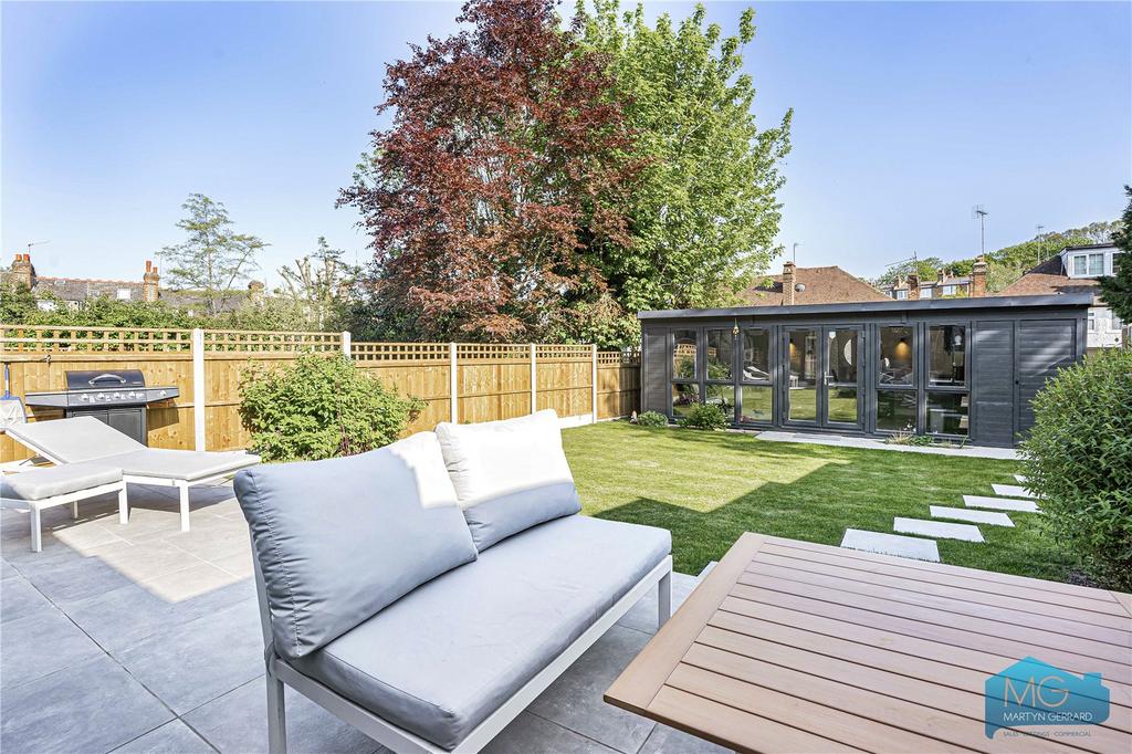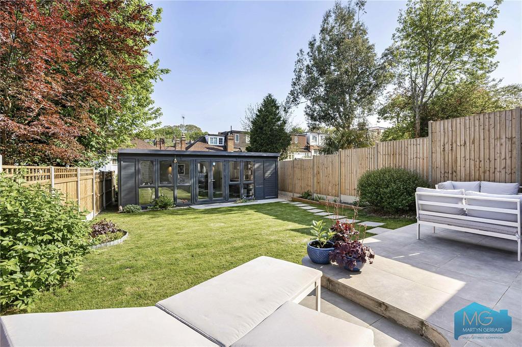 Ground floor garden flat within imposing period building. Architecturally designed with 3 bedrooms, 2 bathrooms, impressive open-plan kitchen-living space flowing into private south-facing garden. Large studio at rear with electricity, water and WC. High specification contemporary finishes. 818 sq ft. Leasehold 138 years. Near Muswell Hill Broadway. EPC E.