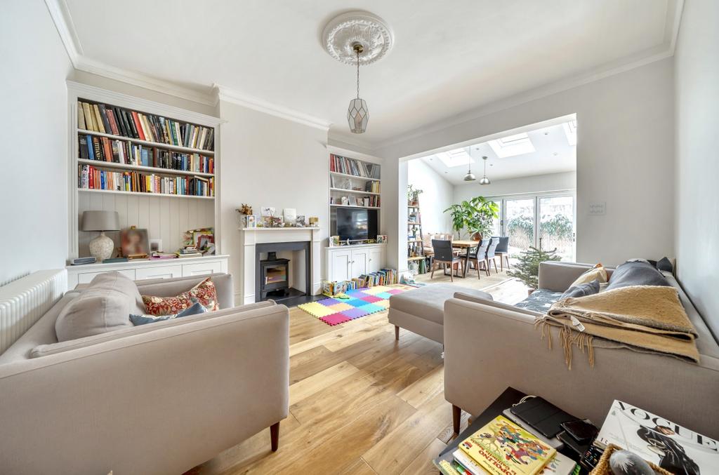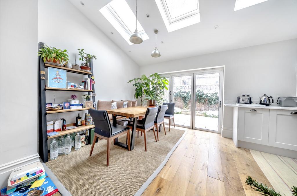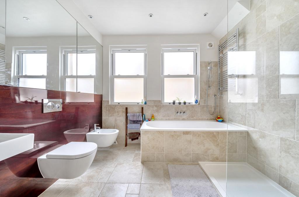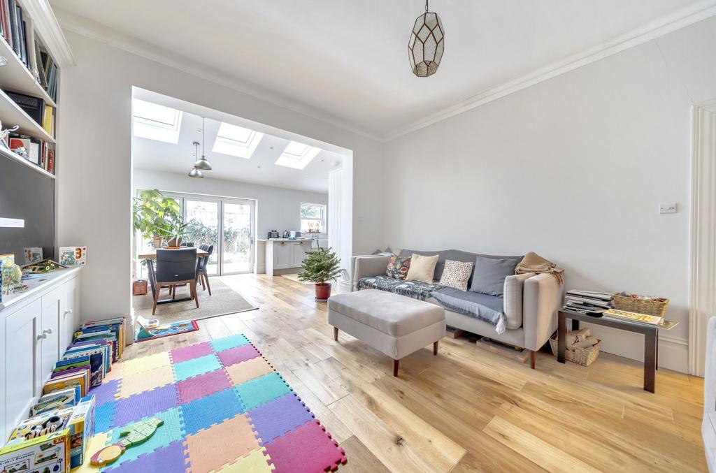 The generous accommodation includes a large hallway with ample storage, a master bedroom with elegant bay window, two further double bedrooms, a luxurious four-piece bathroom with separate walk-in shower, and an additional WC. The impressive double-aspect reception room flows into an open-plan fully fitted kitchen, creating a wonderful entertaining space.